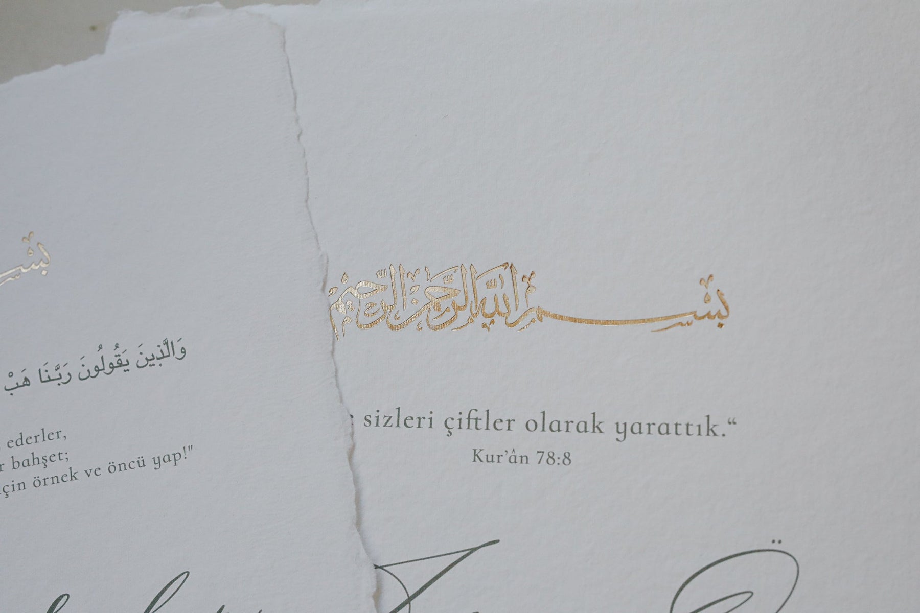 Oben auf dem Zertifikat befindet sich eine elegante Prägung: Ein Herz-Design mit der arabischen Inschrift "We created you in pairs", das eure Verbindung auf besondere Weise symbolisiert.